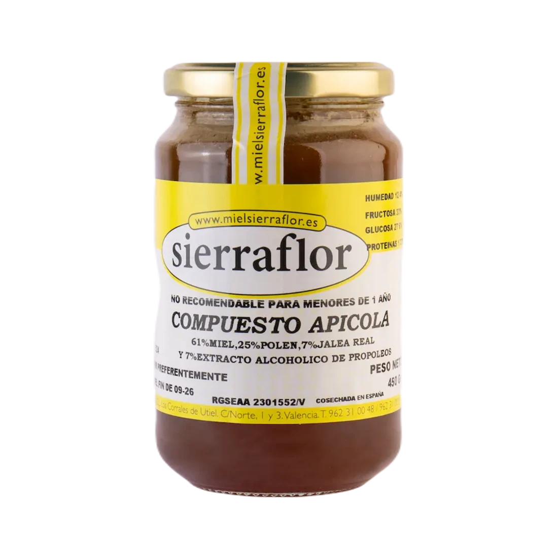 Descubre la sinergia de la colmena en nuestro Compuesto Apícola, una mezcla magistral de los tesoros más nutritivos y protectores que nos brindan las abejas. Este potente elixir combina la dulzura de la miel, la vitalidad de la jalea real, la fuerza del polen y las propiedades defensivas del propóleo, todo en un solo producto. Es el aliado perfecto para quienes buscan un apoyo integral para su energía, bienestar y sistema inmunitario, con la pureza y la potencia que garantizan los productos de entrevinos.shop.