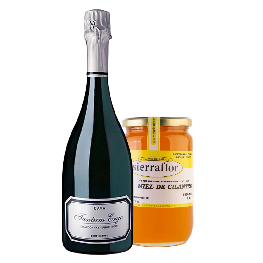 Una combinación audaz que explora las fronteras del sabor. El Cava, Tantum Ergo Pinot Noir Brut Nature, es un Cava rosado seco con notas minerales y acidez punzante. Choca de manera espectacular con el perfil aromático singular de la Miel de Cilantro. El Cava, al ser Brut Nature, enmarca y realza la singularidad de la miel con su frescura.
