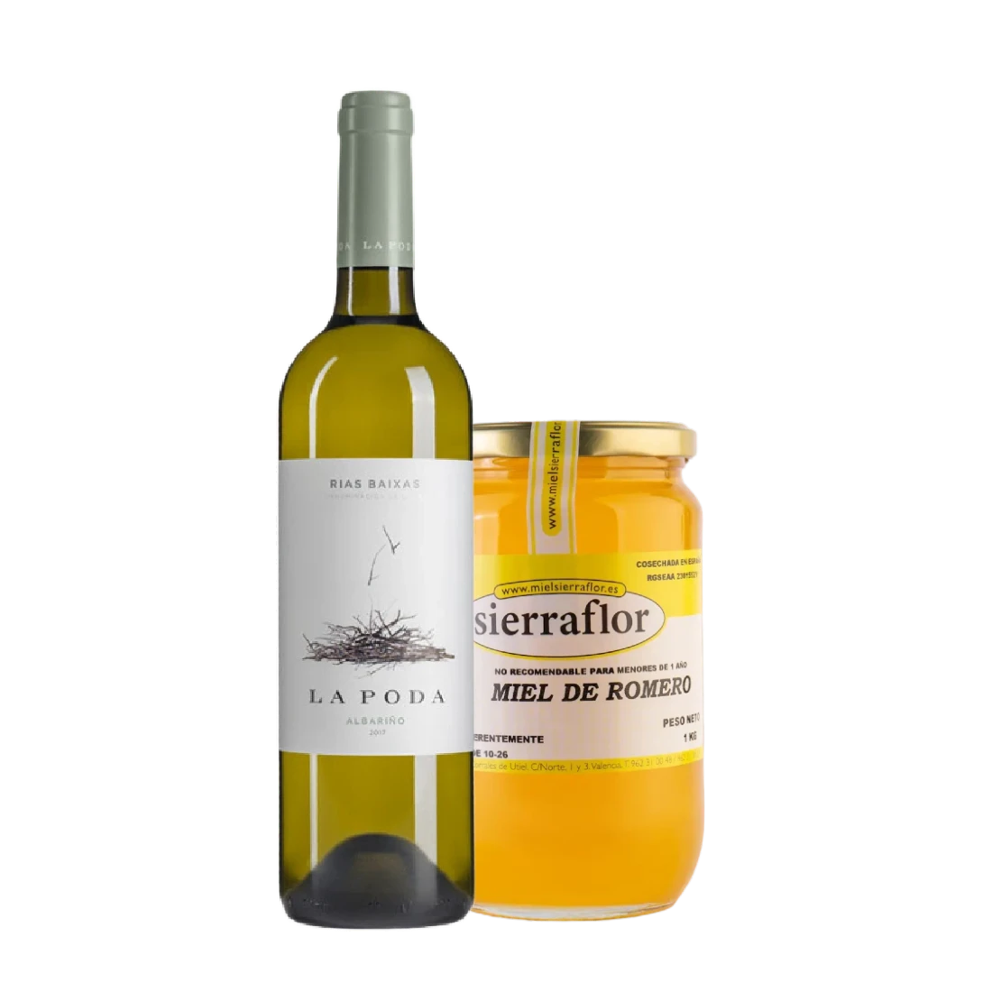 Diseñado para un equilibrio dinámico y fresco, este pack une la pureza atlántica de La Poda Albariño (perfil cítrico y salino, con acidez refrescante) con la Miel de Romero Cristalizada (textura granulosa y sabor herbáceo suave). El contraste salino-ácido del vino y la textura de la miel se funden en un maridaje donde la acidez del vino limpia el paladar.